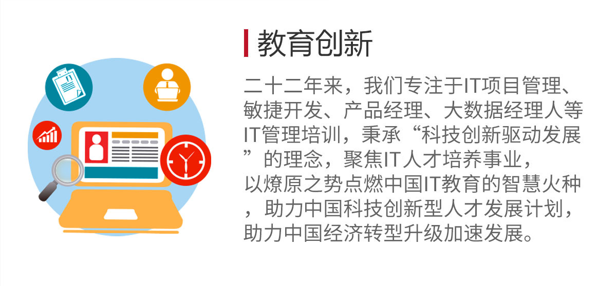 二十四年來,我們專注于IT項目管理、敏捷開發(fā)、產(chǎn)品經(jīng)理、大數(shù)據(jù)經(jīng)理人等IT管理培訓,秉承“科技創(chuàng)新驅動發(fā)展”的理念,聚焦IT高端人才培養(yǎng)事業(yè),以燎原之勢點燃中國IT教育的智慧火種,引領中國科技創(chuàng)新型人才發(fā)展計劃,助力中國經(jīng)濟轉型升級加速發(fā)展。