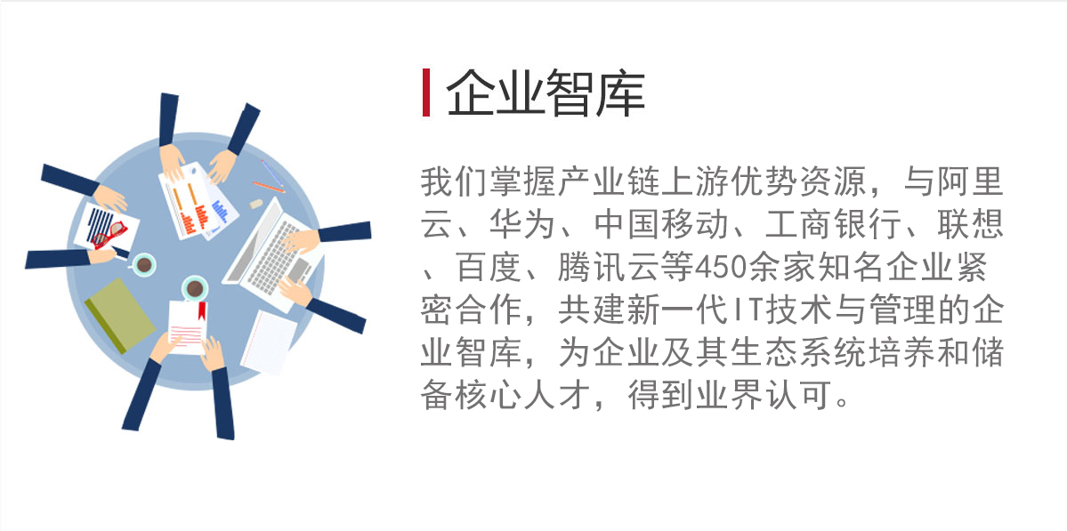 我們掌握產(chǎn)業(yè)鏈上游優(yōu)勢資源,與阿里云、華為、中國移動、工商銀行、聯(lián)想、百度、騰訊云等450余家知名企業(yè)緊密合作,共建新一代IT技術與IT管理的企業(yè)智庫,為企業(yè)及其生態(tài)系統(tǒng)培養(yǎng)和儲備核心人才,得到業(yè)界高度認可。